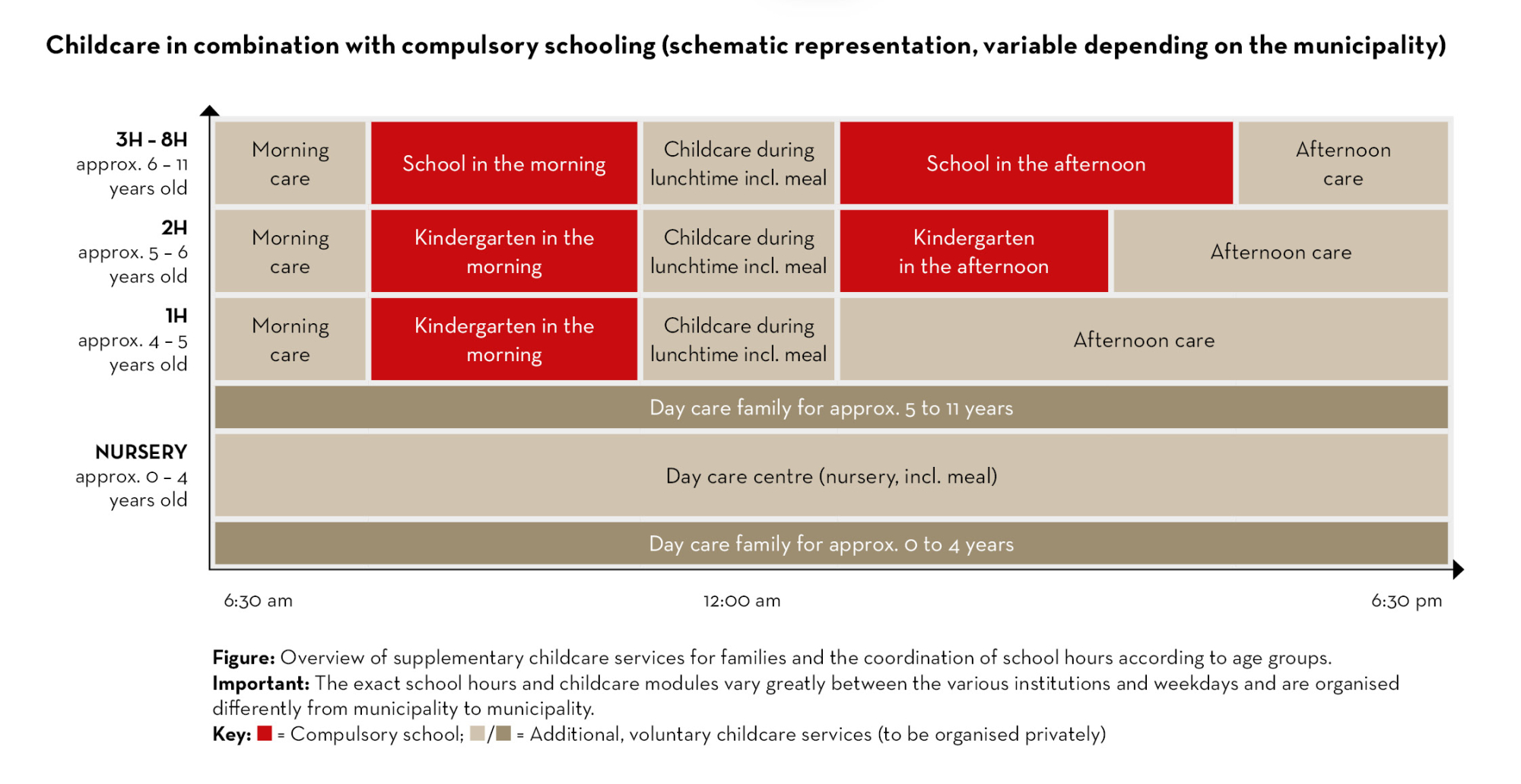 In Switzerland there is no free choice of school (apart from private schools). By law, therefore, the location of kindergarten and school is determined by the place of residence. When choosing your place of residence, pay attention to the range of school services offered as well as the family and school-related childcare options. Some day care centres are organised and financed by a cooperation of municipalities. For this reason, the location of the childcare facility for preschoolage children can also be outside the municipality of residence. On the other hand, childcare services for children of school age are restricted to the school location. The offers differ from municipality to municipality with regard to opening hours, costs and organisation. The range of services offered may not cover all age categories or days. The availability of childcare facilities should be taken into account when choosing a place of residence.